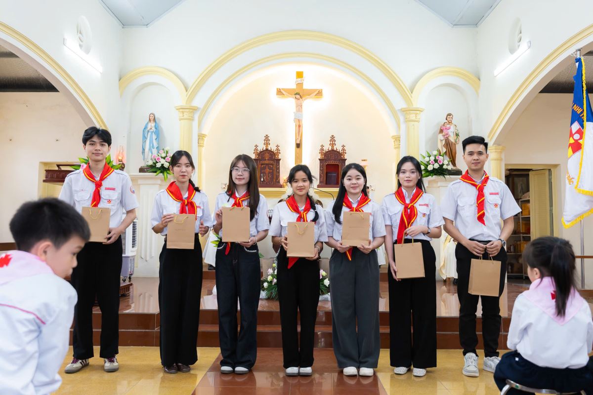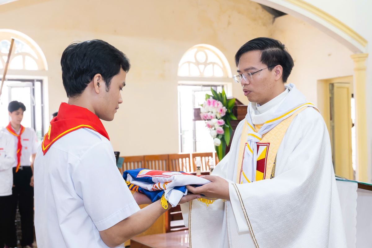 Tiếp đó, cha Giuse Nguyễn Ngọc Bích làm phép khăn và trao khăn cho các em. Xứ đoàn TNTT Phêrô Nêrôn Bắc – Giáo xứ Phú Cát hiện có 55 huynh trưởng, 6 dự trưởng và 195 đoàn sinh thuộc các ngành: Chiên Non, Ấu Nhi, Thiếu Nhi và Nghĩa Sĩ.