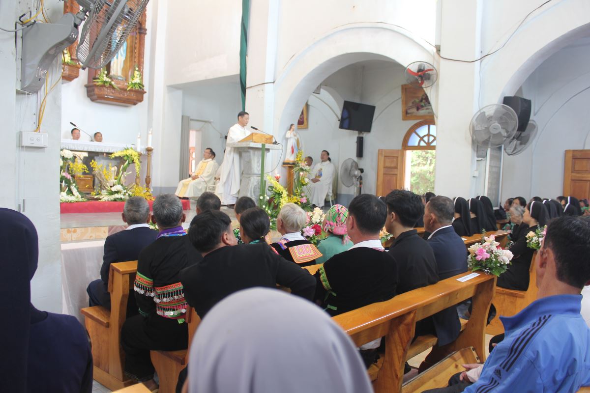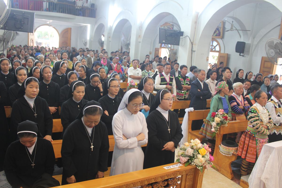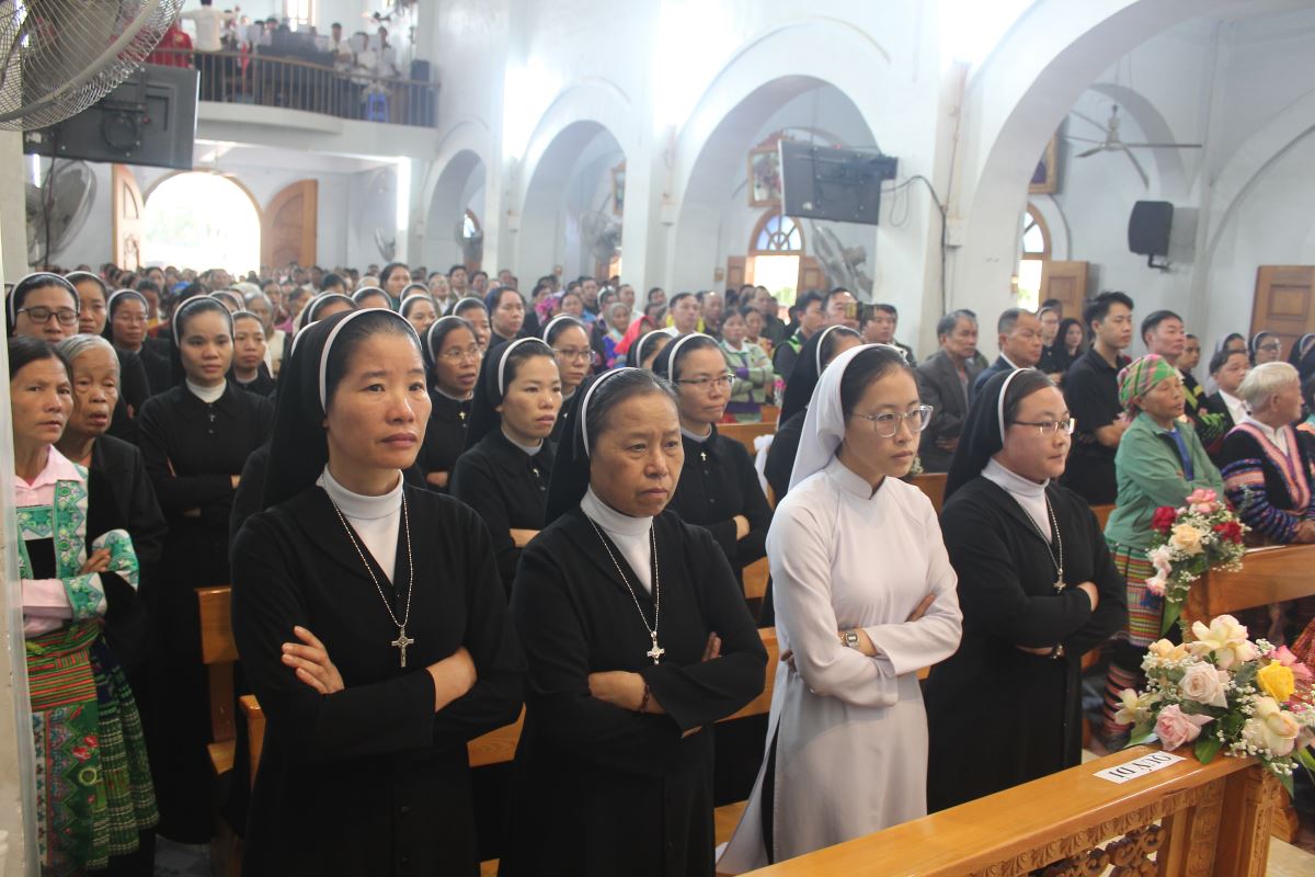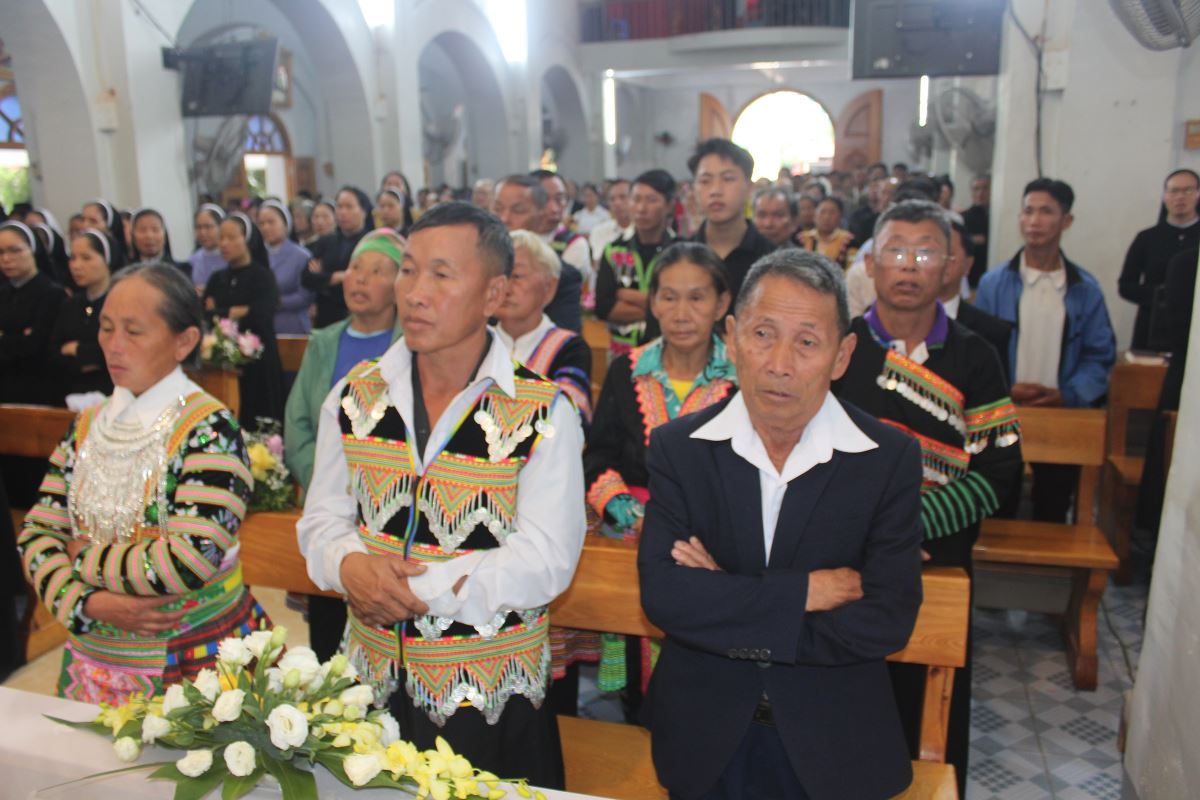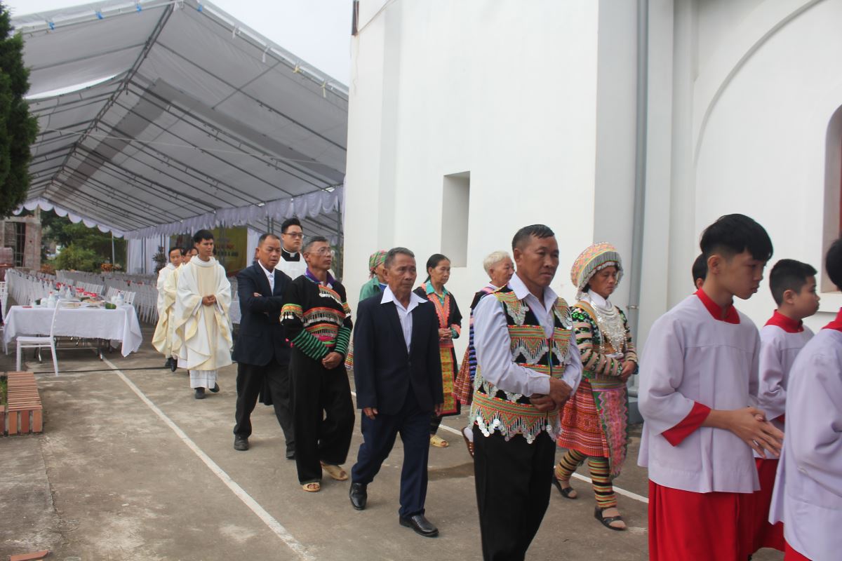 Ngay từ sáng sớm ngày 14/11/2025, khắp khuôn viên nhà thờ và giáo xứ đã rộn ràng tiếng cười nói. Ban tiếp tân trong trang phục áo dài truyền thống màu đỏ, cùng với ban âm thanh, ánh sáng, đội trống, ban nhạc và người dẫn chương trình đã hân hoan đón tiếp các đoàn đại diện từ các giáo xứ, giáo họ, giáo điểm của anh chị em người Kinh và người H’Mông trong giáo hạt Nghĩa Lộ. Ngoài ra, còn có các đoàn đến từ những vùng xa như Sơn La, Phú Thọ, giáo hạt Yên Bái, cùng đại diện các cấp chính quyền địa phương đến chung vui và chúc mừng.