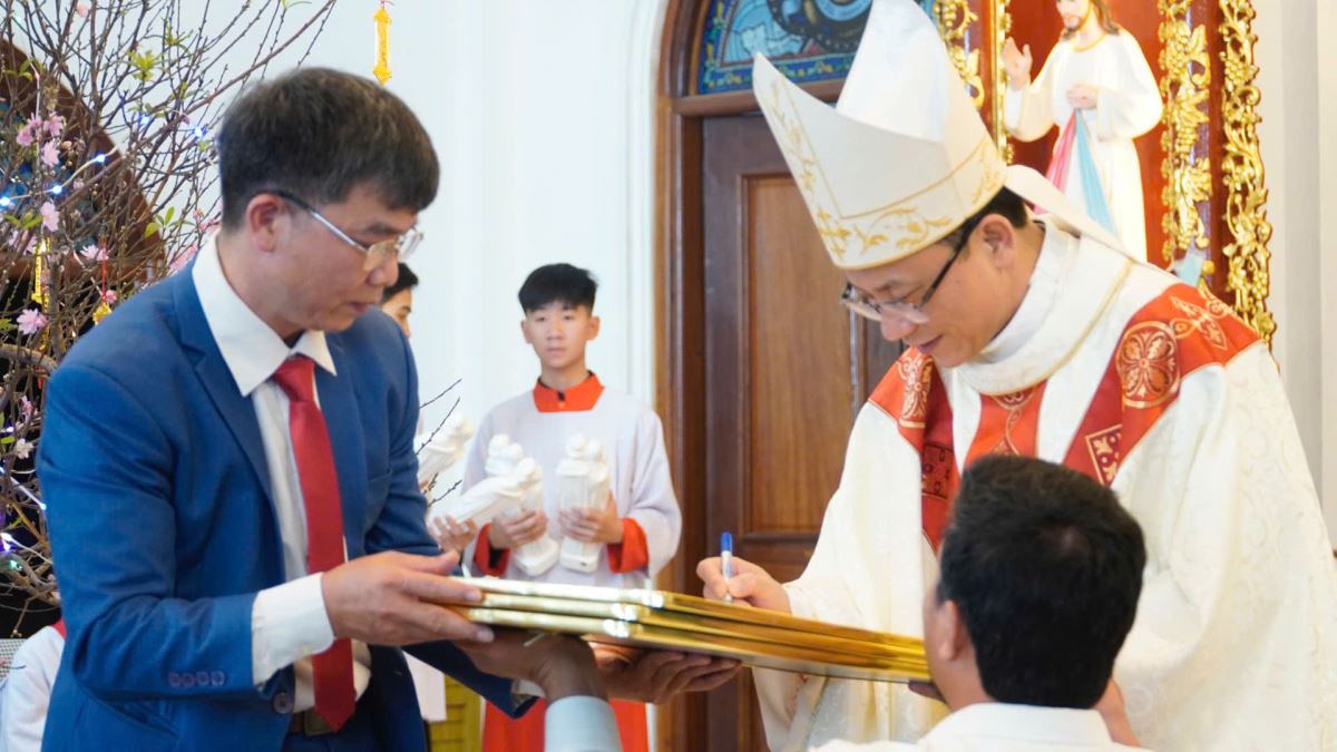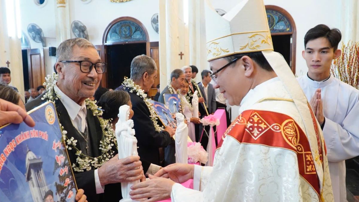Đáp từ, Đức Cha Phaolô đã trao tặng mỗi gia đình một tượng Thánh Gia cùng ảnh lưu niệm do chính ngài ký tên, như một sự gởi gắm tâm tình. Ngài ước mong các gia đình luôn chiêm ngắm mẫu gương Thánh Gia Nazareth để học biết yêu thương, hy sinh và sống theo thánh ý Chúa. Những đóa hoa tươi thắm được con cháu kính dâng ông bà, như lời hứa sẽ tiếp nối truyền thống đạo đức và ngọn lửa trung kiên của các bậc tiền nhân.