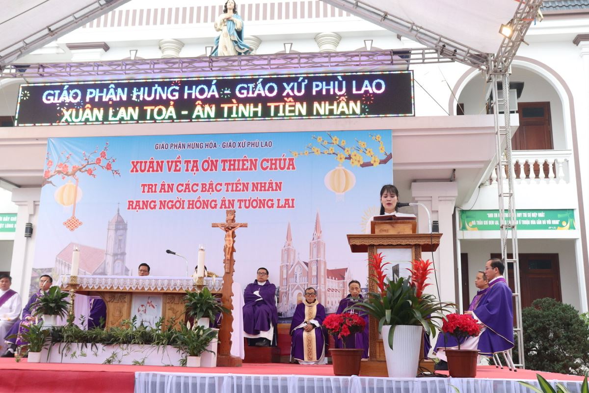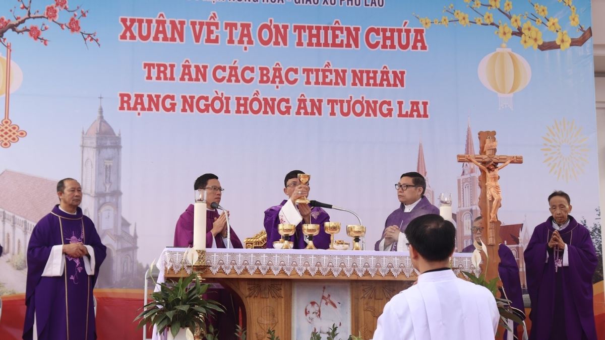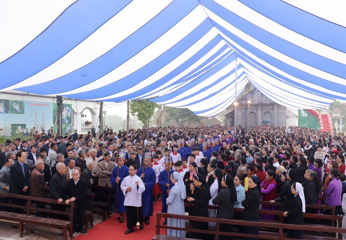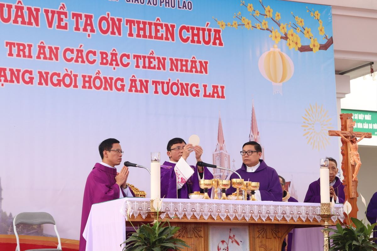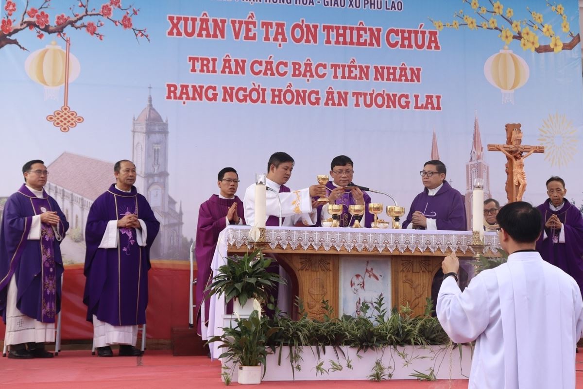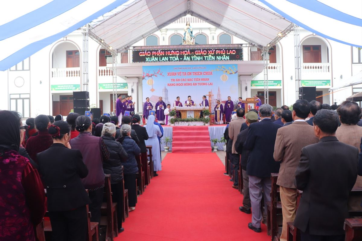 Ngay từ sớm, bầu khí tại giáo xứ đã rộn ràng nhưng rất trang nghiêm. Đúng 08g15, đoàn đồng tế được rước từ ngôi nhà thờ cổ tiến về quảng trường để cử hành Thánh lễ. Chủ sự Thánh lễ là Đức cha Phaolô Nguyễn Quang Đĩnh, Giám mục phụ tá Giáo phận Hưng Hóa – một người con ưu tú của quê hương Phù Lao. Hiệp dâng trong Thánh lễ có sự hiện diện của cha xứ Giuse Trần Minh Trọng, quý cha tiền nhiệm, quý cha quản hạt, quý cha quê hương, quý cha khách, cùng quý thầy, quý dì, quý khách và toàn thể cộng đoàn dân Chúa Giáo xứ Phù Lao.