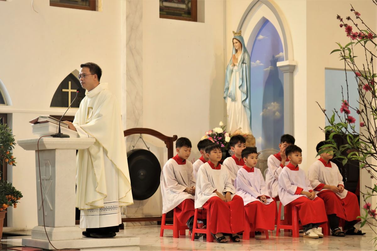 Đáp từ, cha chủ tế bày tỏ niềm vui khi được hiệp dâng Thánh lễ tất niên cùng cộng đoàn, và gửi lời chúc năm mới tới toàn thể mọi người, xin Chúa ban cho từng gia đình một năm mới bình an, mạnh khỏe và đời sống đức tin ngày càng thăng tiến.