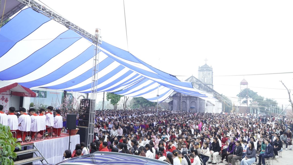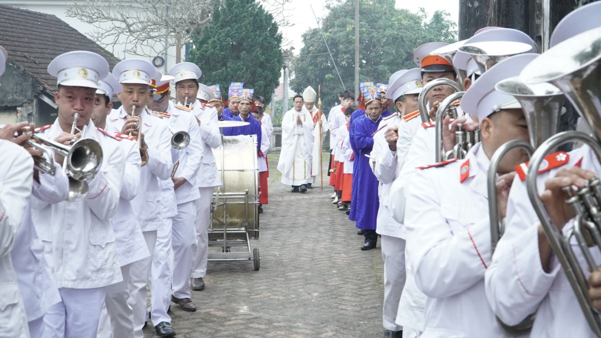 Trước Thánh lễ, vào lúc 07g15, đoàn rước tiến từ nhà thờ cổ kính ra quảng trường giáo xứ trong bầu khí trang nghiêm, sốt sắng, với tiếng kèn trống và lời ca tiếng hát đầu xuân, diễn tả niềm vui đức tin của cộng đoàn trong Thánh lễ đầu năm mới.