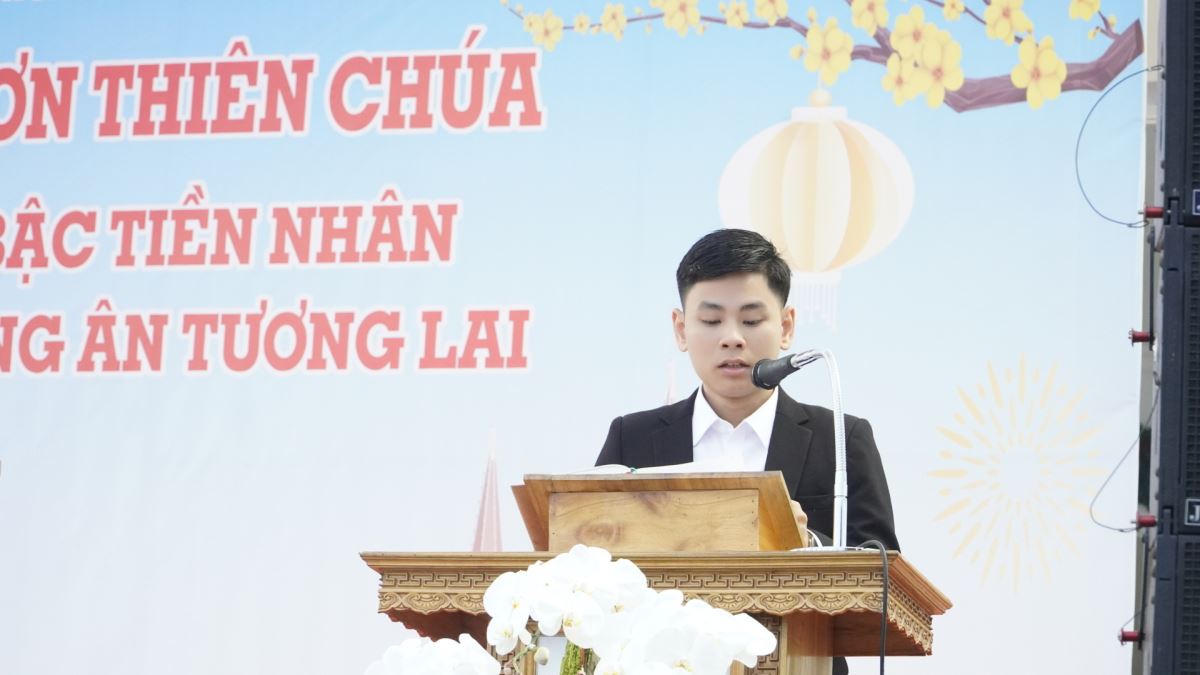 Sau lời nguyện hiệp lễ, ông Phaolô Nguyễn Văn Phú – Chủ tịch Hội đồng Giáo xứ thay lời cộng đoàn chúc mừng năm mới Đức Cha, cha xứ, quý thầy và quý dì. Đức Cha đáp từ, bày tỏ niềm vui khi trở về quê hương dâng lễ đầu xuân, đồng thời gửi lời cầu chúc năm mới bình an, hiệp nhất và tràn đầy ơn Chúa tới mọi gia đình trong giáo xứ.