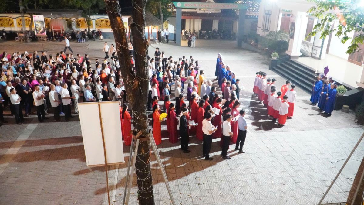 Tại quảng trường giáo xứ, cộng đoàn bắt đầu với nghi thức đi Đàng Thánh Giá. Qua từng chặng đàng, mọi người cùng dừng lại suy ngẫm về hành trình khổ nạn đau thương mà Chúa đã gánh chịu vì tội lỗi của nhân loại. Kết thúc các chặng đàng, đoàn rước tiến về nhà đa năng để bước vào phần phụng vụ Lời Chúa.